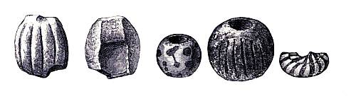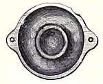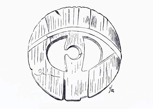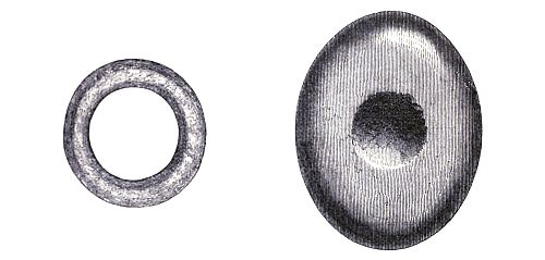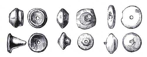 [117] The relics from the Wigtownshire crannogs, besides those already mentioned, are not numerous. From Barlockhart there is a stone ring (Fig. 175), two querns, and a spindle-whorl of clay-slate. From one of the crannogs at Machermore Loch there is a stone implement, with circular hollows on each face (Fig. 175). Regarding such implements Rev. George Wilson writes thus:—"These are of two types, elongated and oval, approaching a circular form, and I wish to direct attention to them because, as yet [1879], only eight have been reported in Scotland, seven of them being from Wigtownshire" (Proc. S. A. Scot., vol. xiv. p. 127). Shortly afterwards another, described at page 422, was found on the crannog of Lochspouts, in Ayrshire.