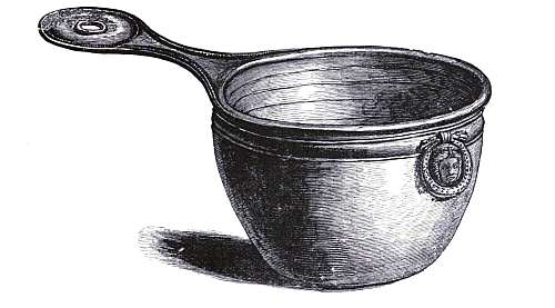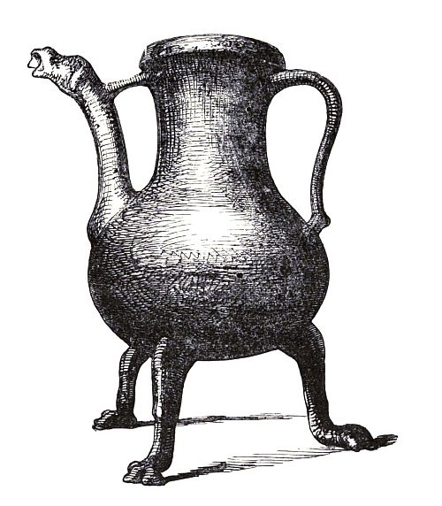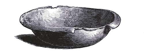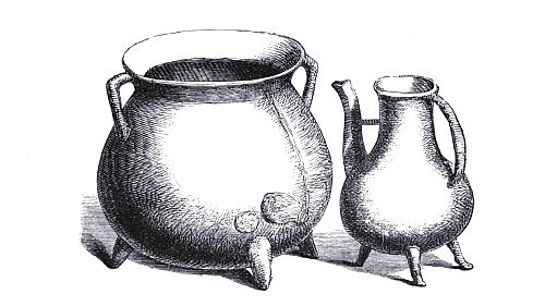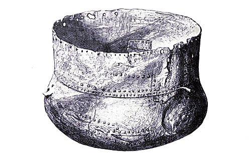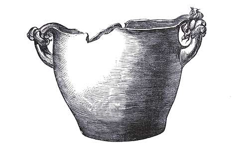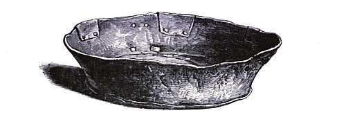 [106] Upon the partial drainage of Carlingwark Loch, in 1765, various kinds of artificial structures were observed, as wooden roadways, dams built of stone and clay, and a couple of islets constructed on a framework of black oak. In the mud were also found various relics, as a brass dagger, 22 inches long, mounted with gold plaiting; a brass pan; a remarkable cauldron (Fig. 172), containing bronze and iron implements; and several large stag-heads.
