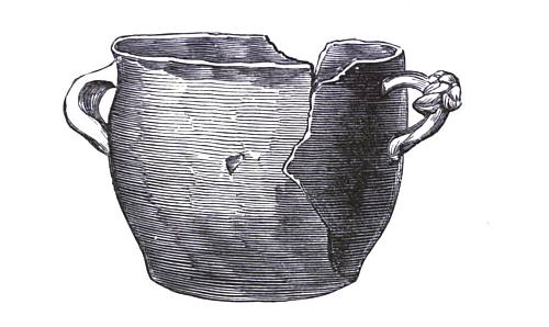 [87] This is a small lake, three and a half miles north of Enniskillen, about a mile in length and half a mile in breadth. It contains three crannogs, the largest of which is 105 feet in diameter. "Here were found querns, whetstones, worked pieces of deer-horn, some fragments of iron plated with bronze, many pieces of ornamented pottery, some of which were furnished with ears or handles; a very curious stone (apparently a tombstone), sculptured with a cross and ornamented with four human heads, and scroll work, and a large boulder, upon which a cross-like figure had been picked or punched out."