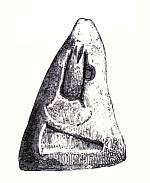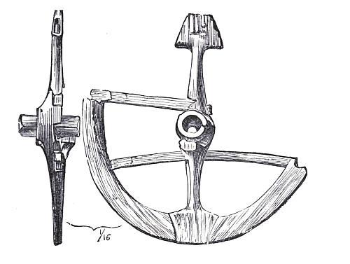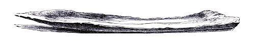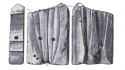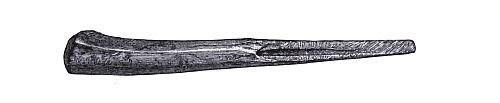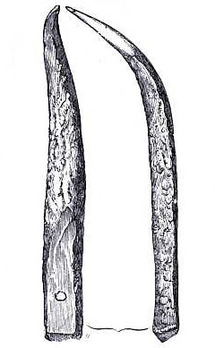 [127] While visiting Mr. Flinders Petrie's collection of antiquities from Egypt lately exhibited in London, I was much interested in seeing a well-shaped wooden sickle with a groove in which a flint saw was still cemented in its place. The groove is adapted for three such saws, but only one remained in its place. The wooden portion of this unique instrument is shaped like a modern corn-hook, with the exception that the handle turns downwards at a right angle to the cutting plane, and the opposite end runs out into a long sharp point. It measures 12½ inches from tip to tip, and 17 from the point to the most bulging part of the body. From the same place were various other flint implements and some semilunar knives or saws, precisely similar to those so common in the Scandinavian archæological area. Mr. Petrie also pointed out some flint objects which were undoubtedly an imitation of implements of copper and bronze with which they were associated. The tombs of Hawara in which these relics were discovered are said to be of the 12th dynasty, dating some 2,600 years B.C.
