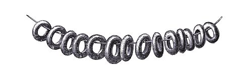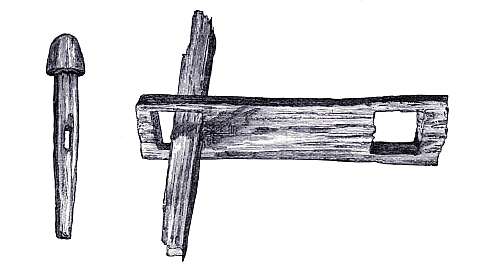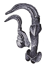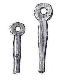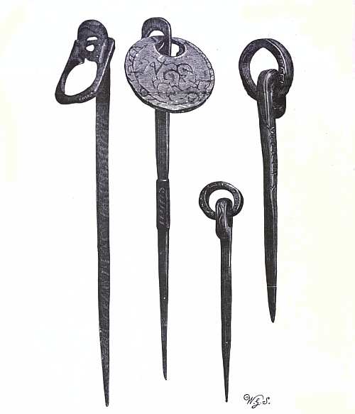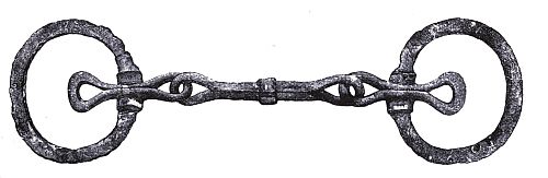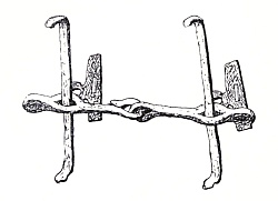 [100] Among the objects from Lagore mentioned by Lord Talbot (Fig. 103) is a peculiar iron pipe, described as of unknown use. It is rather remarkable that it and this bayonet-like object from Buston should be the counterparts of a kind of padlock in use in the earlier Middle Ages, which acted in the following manner:—When a spring-bolt (like that of the object from Buston) was passed through the tube upwards, the spike attached to the latter passed through the perforation in the former. Inside the tube there were two small prominences, which when the bolt was pushed sufficiently home caught the tips of its springs and prevented its return. In this state the padlock was securely locked, and it could only be opened by a key consisting of another but smaller tube, which, when passed through the other end of the larger tube and over the springs, pressed the latter close to the body of the bolt until their tips became clear of the internal catches, and so allowed the spring-bolt to be extracted.