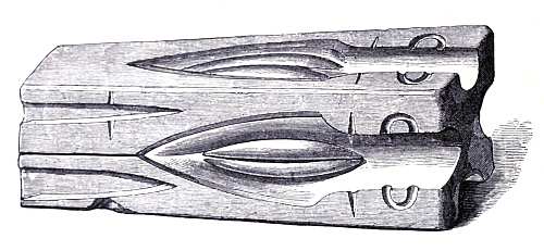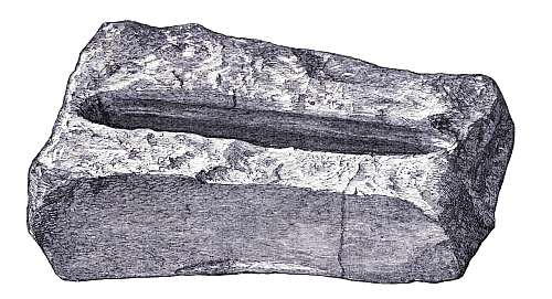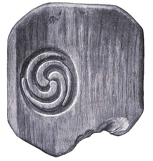 [94] A well-defined stockade, with horizontal beams. A canoe and the following objects recorded from this crannog:—"Two iron swords; a small anvil, very bright and clean; a pair of scales and several hammers; several gold pins; metal dishes; small axe-heads; an iron cauldron of a low dilated shape; a stone of yellowish-white colour, beautifully polished, about twelve inches long, three and a half broad, and two thick, accurately squared at the sides, having a round hole about one and a quarter inch deep and half inch in diameter at each end, the top surface and one of the sides being covered with carved devices; and a quern."