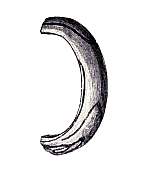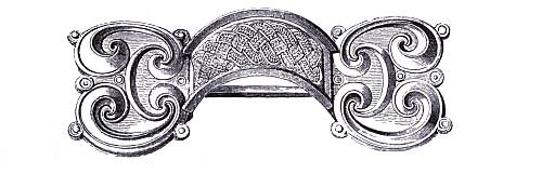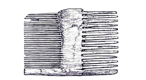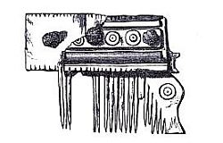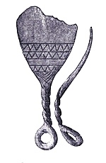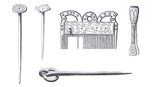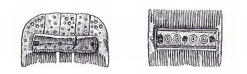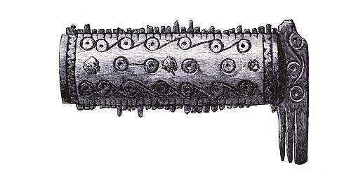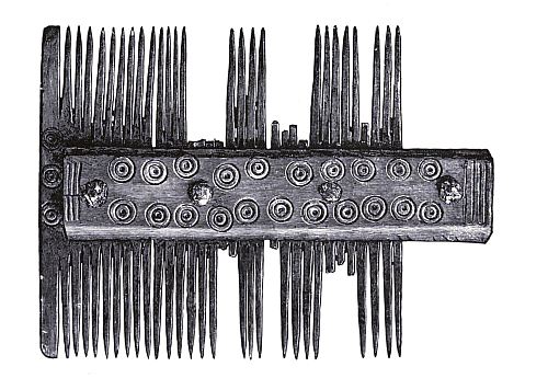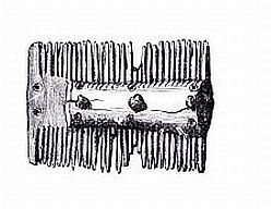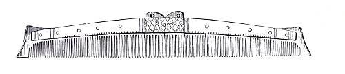 [114] The island is oval in shape, 180 feet long and 135 feet broad in the widest part. Fire-places, wooden floorings, and other woodworks were exposed, and a few relics, viz. an ornamented bone comb (Fig. 174), a flat loop of bronze, part of the rim of a large vessel of cast bronze 3 inches in length, and portion of an armlet of greenish glass, with a blue-and-white twisted cable ornament running round it.