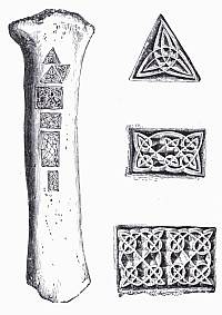 [112] An oval-shaped crannog, 50 feet long by 28 feet broad, constructed of layers of young trees laid transversely. Three fire-places were exposed over the structure, and among the rubbish were found two broken combs made of wood, one of which is here figured (Fig. 173), and a piece of wood with a Greek cross, with crosslets burnt on it.