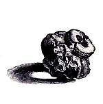 [88] A large crannog, covering about an acre, but only partly artificial. About thirty thousand piles used in strengthening the island, which had a jetty, and near this a canoe was found. The principal relics are—some stone hammers, three pieces of flint scrapers, a bead of amber and another of glass, a small stone ring the size of a finger-ring, fragments of pottery, a crucible, some articles of brass, and portions of bog-ore. The piles were cut by very sharp metal implements.