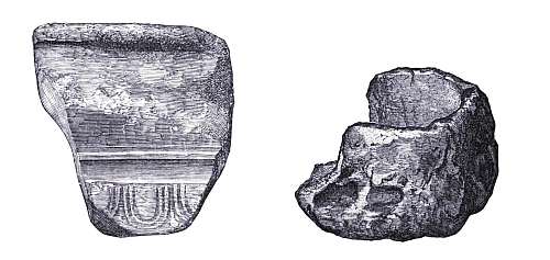[104] The question of submarine crannogs is still obscure, and the few facts that have come to light leave the matter in doubt as to whether the structures were originally constructed in the water or on dry land and subsequently submerged, in consequence of changes in the relative levels of sea and land. The only remains of this character that I know of in Britain are—(1) a cairn of stones on a substratum of wood near the island of Eriska, at the mouth of Loch Crerar; (2) the Black Cairn, in the Beauly Firth; and (3) some stumps of piles in Ardmore Bay, county Waterford. The mound at Eriska, which was found on examination to be of circular shape and 60 feet in diameter, was dry at low water, but submerged at spring-tides to the extent of five feet. Some ashes and charcoal and the broken bones of sheep and small oxen were the only relics of human occupancy found. The Black Cairn is noticed in the Statistical Account of Scotland, and also by Miss Maclagan. It is about four hundred yards within flood-mark. The top is only visible at low water, and the base is said to be composed of very large wooden beams.