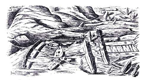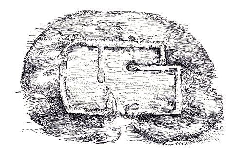 [89] In 1833 Captain W. Mudge, R.N., discovered here a wooden hut made of a framework of large oak beams mortised at the four corners. It measured 12 feet square and 9 feet high, and about half way up there was a flooring which divided the space into two storeys. The roof of this unique hut was buried in the peat 16 feet from the surface, and its base rested on a substratum of brushwood resembling a crannog. (See p. 489).