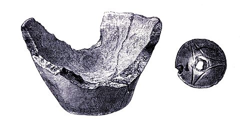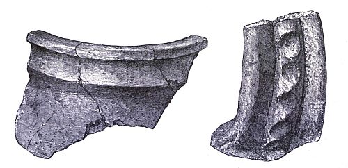 [83] A small crannog discovered by turf-cutters, and "interesting from the fact of instruments made of iron and stone having been found together." Among other things were a bronze pin, fragments of crucibles, bits of anthracite coal, a socketed iron implement, two small flint knives, a stone celt, a round flat stone with an oblong-worked indentation on each side, and several bits of rude pottery.