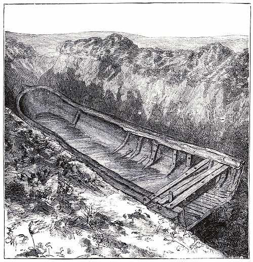 [107] "In draining a lake at the east end of the parish of Croy, an artificial mound appeared within a few yards of the shore, about sixty feet in circumference and five in height. It was formed of alternate strata of stones, earth, and oak; piles of oak being driven in the ground were kept strongly fixed by transverse beams of smaller size. Over these were round stones, and on the surface some inches of fine black mould. Some fragments of brass rings, pieces of pottery, and the bolt of a lock of no ordinary size, were found on the mound. At about a hundred yards distance there is a circle of large piles of oak, driven deep in the earth, apparently the commencement of a second mound; but for what purpose they were intended it is impossible to conjecture. At the same time a canoe, of most beautiful workmanship, was found, which some modern Goth has since cut down for mean and servile purposes."