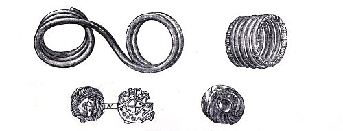[95] "In another crannog in Rahan's Lake," says Mr. Morant, "we found five Queen Mary shillings, fused into a mass; a bronze pin; a flat spear-head, and a stone celt. We also found the hearth-stones and a quantity of ashes. The piles around the island are still visible above the water."
