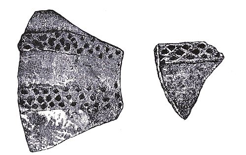 [113] Half a century ago Loch Leven was lowered nine feet by drainage, and at the present time the remains of the lake-dwelling are always from one to three feet under water. The mound measures 35 yards by 20 yards, and 1½ to 2 feet in height. In this area were detected the stumps of two rows of piles, twelve feet apart, and each pile was four or five feet apart. Also, in a line stretching to the shore, which is about sixty yards distant, there were one or two piles encountered, as if forming part of a gangway. The lake-bottom is here firm, and not liable to compression, so that the structure, whether ancient or modern, was really a pile-building. The only relics are a bit of carved wood, which might have been a handle, and a fragment of archaic-like pottery.