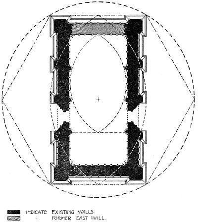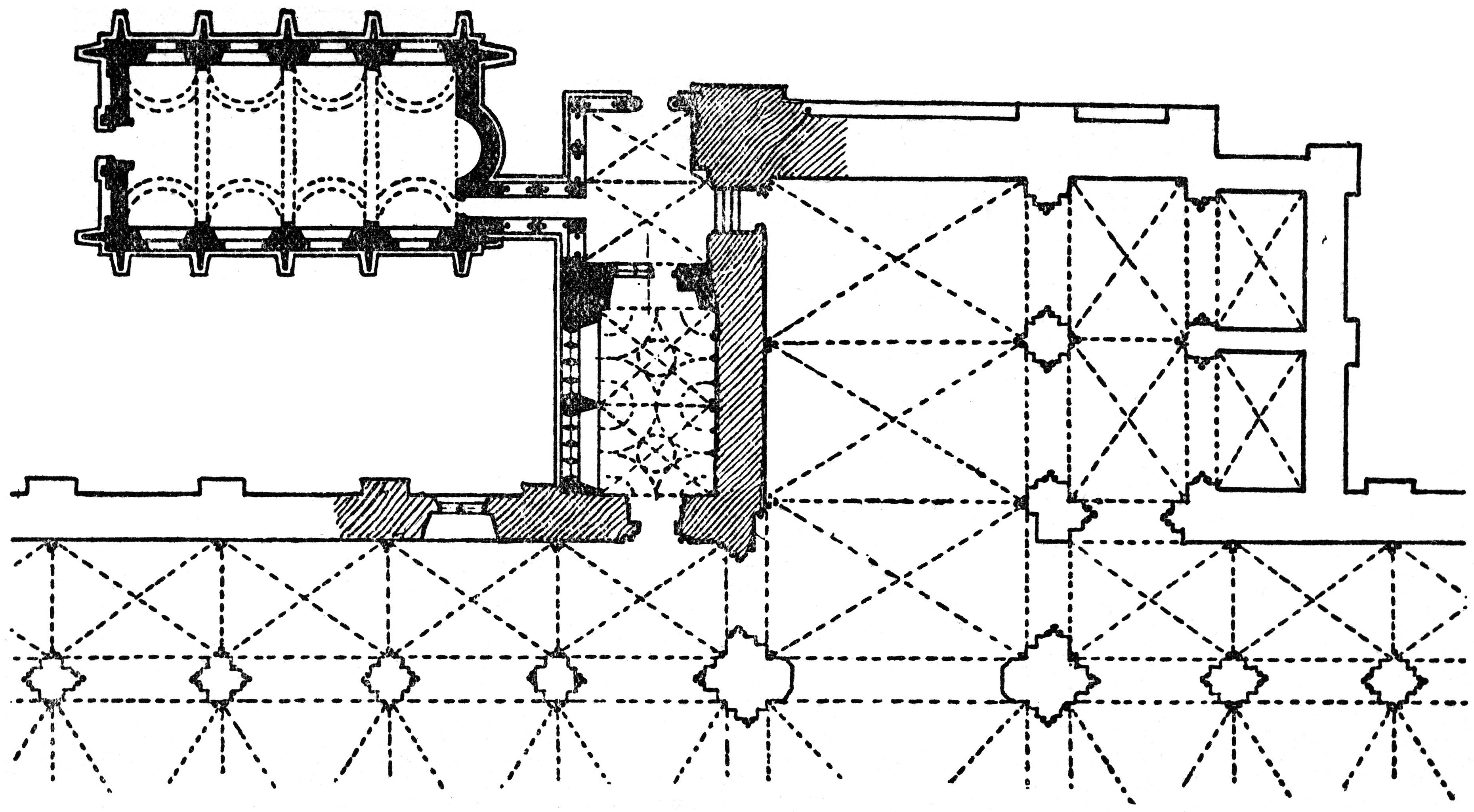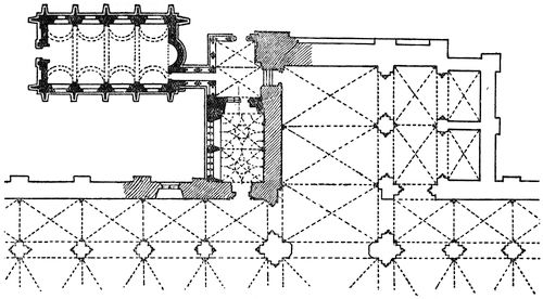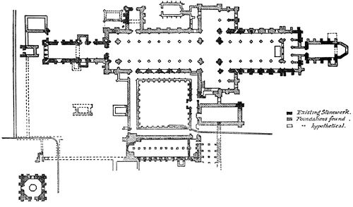 22 The great breadth of the footings of the rectangular part of Edgar's Chapel—about 6 feet 6 inches on the north and south walls—might easily have inspired a wrong opinion as to the substance of the walls themselves. But students of the work of this date are familiar with the fact that the flat and heavy fan-vaulted stone roofs of the Tudor period require, in addition to their external buttresses, a certain amount of interior support, which is given by building the walls as a series of hollow bays, the windows occupying the recesses, and the intermediate masses being brought out inwards, as piers or counterforts, the same being architecturally treated, so that the description elsewhere given of "piers as panellæ" is quite probably accurate, as a description of such features.—F.B.B.
