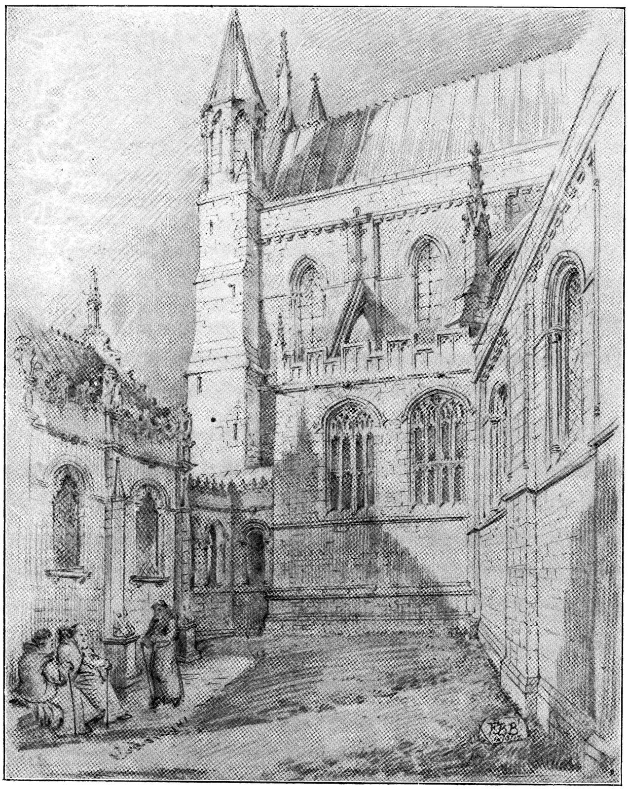 That the building in the angle of the nave and transept was formed with the double object of a support to the weak walls of the crossing, and as a covered approach to the Chapel of the Loretto, erected by Abbot Bere on a site adjoining the north side of the nave, but not attached directly to same, and that this cloister was built in the later English style in which his own masons were expert. |