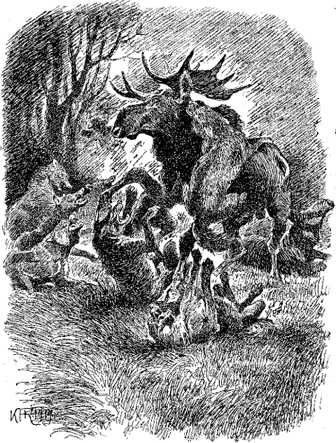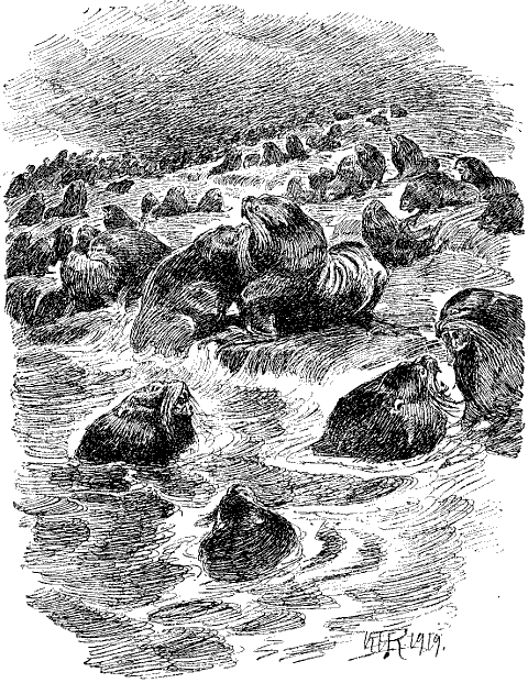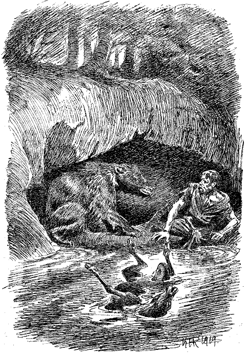 Als er das Ende des langen Tisches erreicht hatte, hob sich der seltsame Gast auf die Hinterfüße und so stand er da, eine mächtige Gestalt wie Tim Gallagher,[S. 12] die großen Pelzpfoten demütig über der breiten Brust gekreuzt. Flehend blickte er um sich, dann begann er zu keuchen wie ein Motor, denn in der rauchigen Luft fing seine Nase einen rätselhaften, aber im ganzen höchst erfreulichen Duft auf.