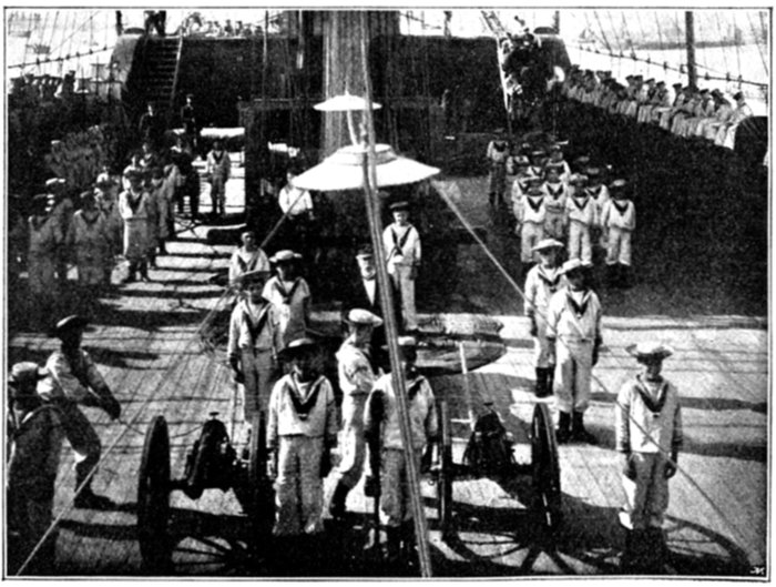 At sea the body is sewn up in a canvas sack, which is heavily weighted at the foot, and this is laid on a "coaming" (a part of one of the hatches), which takes the place of a bier. The whole is covered with a Union Jack, which is fastened to the four corners of the "coaming," so that when the time comes to commit the body to the deep the one end of the "coaming" is raised and the body slips off into the water, leaving the flag in its place.