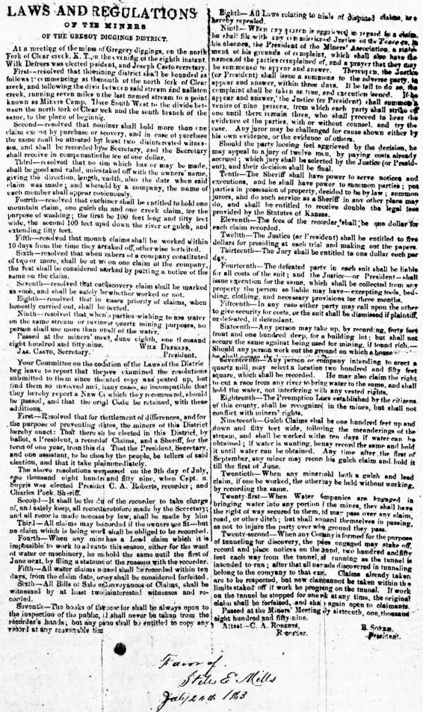 The Library of Congress recently acquired its earliest example of Colorado printing, a broadside entitled Laws and Regulations of the Miners of the Gregory Diggings District, attributed to the Byers & Co. press. Printed sometime after July 16, 1859, it is one of but two located copies of the first extant Colorado imprint other than a newspaper or newspaper extra.[132] The laws, passed at miners' meetings on June 8 and July 16, apply to the district named for John Gregory, whose successful prospecting helped to stimulate the famous Pike's Peak gold rush. They were placed in historical context by Peter C. Schank, assistant chief of the American-British Law Division in the Library of Congress, in an article announcing this acquisition: