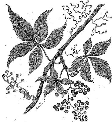 The stem of the vine is nearly smooth in texture; the aerial rootlets (Fig. 1, A A A), which start from all parts of the stem, are of a bright brown color when young. The masses of berries when unripe are of a light green color; when ripe, of an ashen gray. Below the mass of this year's berries are generally to be found those of last year. The leaf has a smooth and somewhat shiny texture, and curves downward from the midrib. To many people the slightest contact with the leaves of the ivy will produce poisoning. I have known of instances where persons in passing masses of ivy-vine, particularly when the wind was blowing from the vine toward the passer-by, became severely poisoned. One of our most beautiful native vines, the so-called Virginia creeper, which frequently grows side by side with the ivy, is often mistaken for it, and blamed for the evil doings of its neighbor, and yet is so innocent and beautiful a vine that I have figured it in full fruit (Fig. 2). The Virginia creeper has a leaf consisting of five lobes, which are distinctly notched, and which curve upward from the midrib. Instead of aerial rootlets like the ivy, it has stout tendrils more or less twisted and curled, often assuming the form of a spiral spring. These tendrils are provided with a disk by means of which an attachment is made to any object within reach (see Fig. 2, B B).