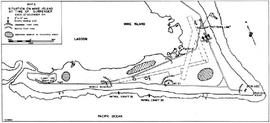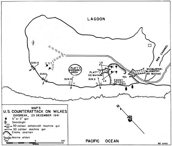 Devereux, still isolated from his units and literally in the dark about the actions on Wilkes and those in the vicinity of Camp 1, attempted as best he could to keep the island commander informed. Cunningham, consequently, also had scant comprehension of the way the fighting was progressing in those areas. At 0500, about the time Captain Platt was reconnoitering the Japanese position on Wilkes, Cunningham radioed Commandant 14th Naval District, “Enemy on island. Issue in doubt.”