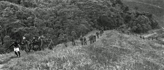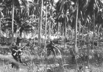 The night landing under conditions of low visibility and heavy seas turned into a fiasco. The APDs began debarkation in the wrong spot, their Higgins boats lost formation when they attempted to pass through the LCIs loaded with soldiers, and the two raider companies ended up being scattered along seven miles of coastline. When the Army units began to land after daylight, they found just 75 Marines holding the designated beachhead. A two-man patrol (one lieutenant each from the raiders and the Army battalion) had been ashore since mid-June to reconnoiter with the aid of native scouts. They provided the exact location of the Japanese garrison, and the joint force soon headed to the northeast toward its objective. Native scouts and the handful of Marines led the way, with two Army companies (F and G) in trace. The remaining raiders were to join up with their unit as soon as they could. All but one platoon did catch up by the time the Americans reached their line of departure a few hundred yards north of the village.