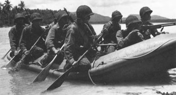 The 10-man rubber boat was designed to be the primary assault landing craft of the Marine raiders. These members of the 1st Raider Battalion sprint ashore after a practice landing through the surf on the island of Samoa in the summer of 1942.