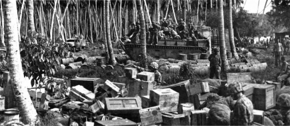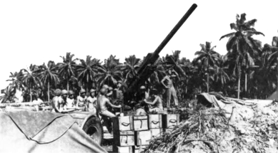 In many cases, 9th Defense Battalion equipment had to be dismantled and carried to assigned areas. The 9th’s motor transport section performed as best it could with the resources available and until the majority of its vehicles burned out from the strain of operating in the Rendova muck. Their task was made easier by the amphibious tractors, which were the only sure means of transportation and these had troubles of their own as they threw off their tracks on uneven terrain. “Frances,” “Tootsie,” and “Gladys” were three amphibious tractors in the beach area manned by nine 3d Division Marines who operated continuously keeping supplies moving from position to position. All tractors were damaged eventually in the Japanese air attacks that followed.