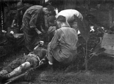 Earning special credit during this period were the battalion’s attached Navy corpsmen and doctors, who performed their work in the midst of enemy raids and under the most trying conditions. Besides caring for the 9th’s casualties at the battalion aid station set up on the exposed East Beach of Rendova, battalion surgeon Lieutenant Commander Miles C. Krepelas treated many Navy wounded, and Army troops returning from New Georgia who could not locate their own medical detachments.
