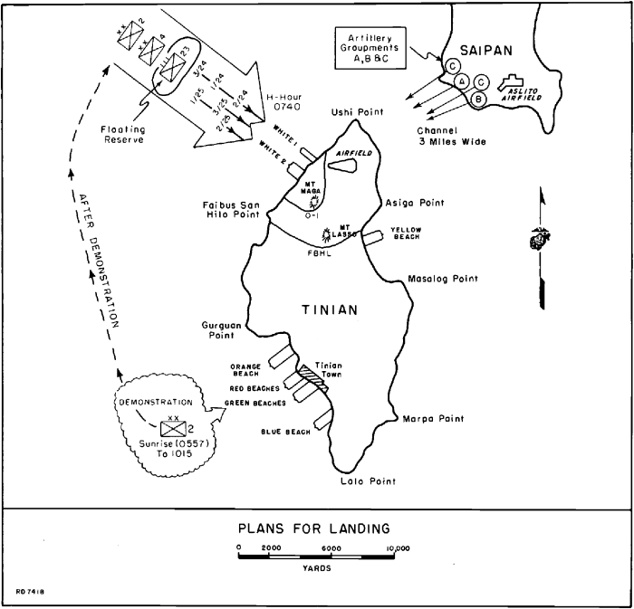 The 4th was designated the assault division for Tinian. The beaches were not wide enough to accommodate battalions landing abreast, much less divisions. Instead, the assault troops would land by columns—squads, platoons, and companies.