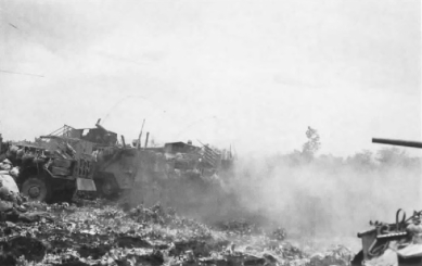 The 2d Battalion of the 23d had similar difficulties. After coming under fire from riflemen and machine gunners, one of its supporting tanks was disabled by a mine. After its crew was taken to safety by another tank, the disabled vehicle was seized by the Japanese and used as an25 armored machine gun nest. Other tanks soon took it out. The 23d also lost that day two 37mm guns and a one-ton truck belonging to the regiment’s half-track platoon. The guns and the vehicle got too far out front, came under heavy fire and were abandoned. A detail from the platoon later retrieved one of the guns, removed the breech block from the other one and brought back the .50-caliber machine gun from its mounting on the truck.