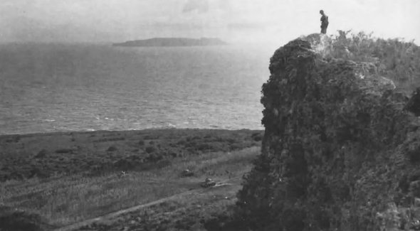 The end of the battle is in sight as troops of the 24th Marines and tanks of the 4th Tank Battalion comb across the coastal plateau at Tinian’s extreme southern end. The 23d Marines, whose zone ended at the top of the steep cliff seen in this picture, had to retrace its steps in order to reach the lowlands. Aguijan Island may be seen dimly in the misty background.