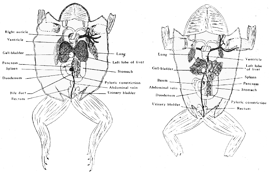 [In the Frog the adrenal bodies may be seen on the ventral sides of the kidneys as small yellow patches.]