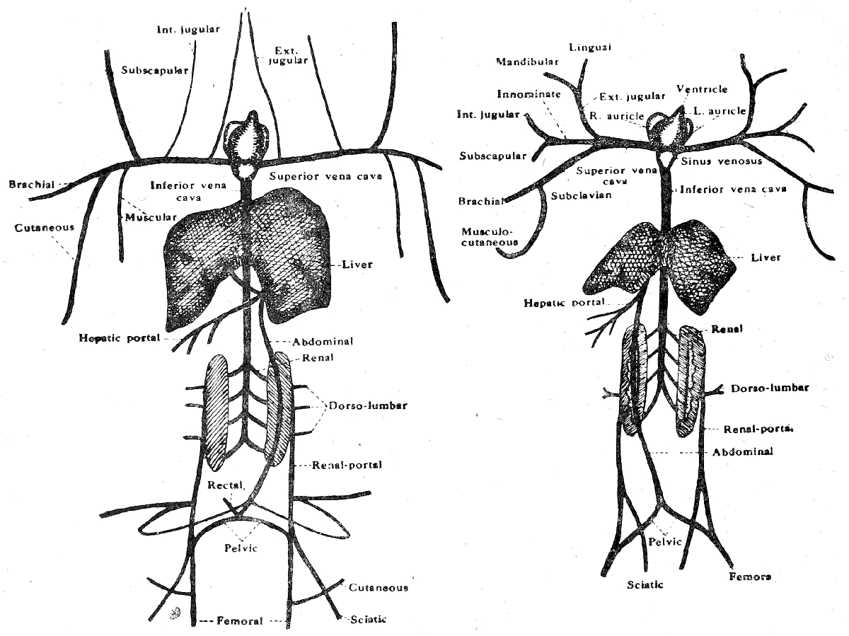 [In the Frog a single musculo-cutaneous vein is seen lying under the pectoralis muscle and extends on to the skin.]