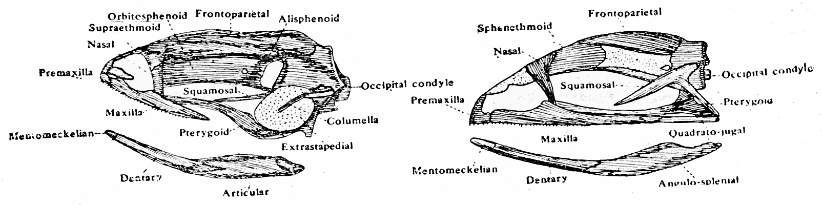 [In the Frog there is no supra-ethmoid present, but a sphenethmoid closes the front of the cranial cavity. The sides of the skull are cartilaginous. A quadrato-jugal is well marked, but the quadrate consists of a piece of cartilage at the posterior end of the quadrato-jugal between the pterygoid and the squamosal. The lower jaw articulates with it. The columella is usually not well shown.]