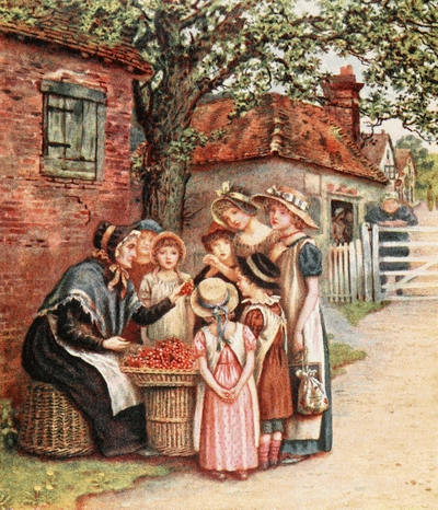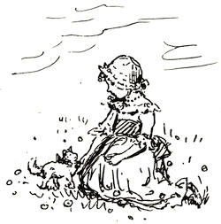 [72] The net profit to Miss Greenaway was £645. The most important pictures sold were ‘Little Girl with Tea Rose’ (35 guineas), ‘Going to School’ (35 guineas), ‘Betty’ (35 guineas),’Girl in Pink and Black—Grey Muff’ (60 guineas), ‘Little Girl in Scarlet Coat and Tippet’ (35 guineas), ‘A Girl in Hat and Feathers’ (45 guineas), ‘Thoughts of the Sea’ (35 guineas), ‘Two Girls in a Garden’ (35 guineas), ‘Lilies’ (35 guineas), and ‘Baby Boy in Blue Coat and Tippet’ (35 guineas).