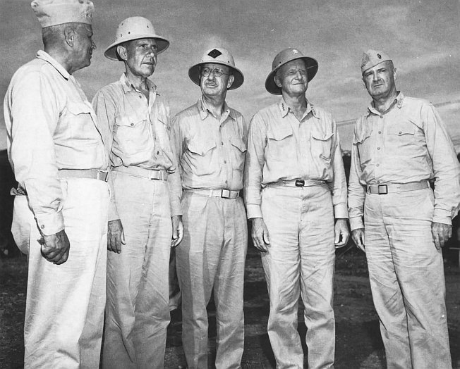 The architects of victory in the Pacific met together on Guam on 10 August 1944, when Indianapolis (CA 35) brought Commandant of the Marine Corps LtGen Alexander A. Vandegrift together with Commander in Chief, Pacific Fleet, Adm Chester W. Nimitz and Fifth Fleet Commander Adm Raymond L. Spruance to the island. From left are MajGen Roy S. Geiger, Commanding General, III Amphibious Corps; Adm Spruance; LtGen Holland M. Smith, Commanding General, Fleet Marine Force, Pacific; Adm Nimitz; and Gen Vandegrift. While together they discussed the future course of the Pacific War.
