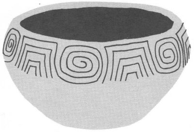 Of course the Master Farmers made other types of pottery, too. Some were open bowls, and others had an incurving rim which gracefully repeated the curve of the lower portion just below the belly. There were also deep, straight-sided jars with extremely thick walls, and big shallow bowls several feet in diameter which have been called salt pans from the belief that the type was sometimes used in the making of that substance. Actually they were probably the large family food bowl in common use also in later times. Impressions of a twined cloth fabric on the outer surfaces of the latter, some cord marking, and crude scoring or other treatment of the sides of the former were exceptions to the general rule of smooth surfaces during this period.