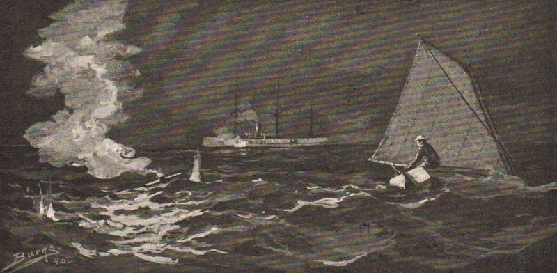 When he was full three miles out from shore again, and perhaps eight miles from the Dart, he set off another red light, giving it, as before, a long fuse. He was hardly fifty feet away from it when there came another crash from the[Pg 79] cruiser—a deep boom this time from one of her heavy guns, followed by a shower of bullets from the Gatling; he heard them whistling and shrieking through the air, but he was not struck. The red light had not even begun to burn yet; the cruiser's watchful men had seen the spark burning at the end of the fuse.