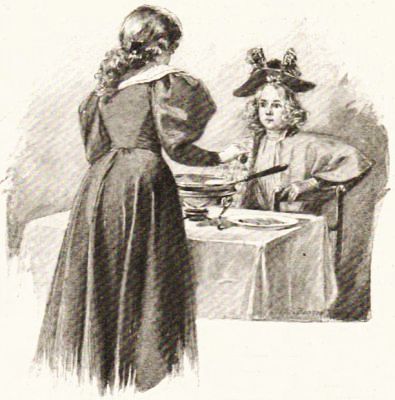As they had gone down the hallway they caught a glimpse, through the open door on the right, of a group of men in red coats, with much glitter of gold lace and many buttons, who could be seen through the thick clouds of tobacco smoke seated about a large steaming punch-bowl on a great oak table. They were some of the officers of his Majesty's forces that had been sent to "protect" the inhabitants of his "thankless colonies."