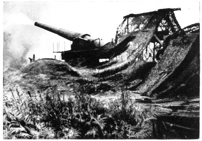 CAMOUFLAGED HEAVY GUN ABOUT TO FIRE.