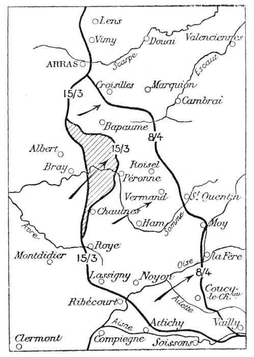 The Germans recaptured Chaulnes in March, 1918. On August 8 of the same year—their front having been pierced before Amiens—they were forced[Pg 131] to evacuate the Montdidier "pocket" and to retreat to the outskirts of Chaulnes. They reoccupied their positions of the trench warfare period, and the remains of their ancient defence-works were still strong enough to enable them to hold up the British pursuit. The town was only carried on August 28, after being surrounded.