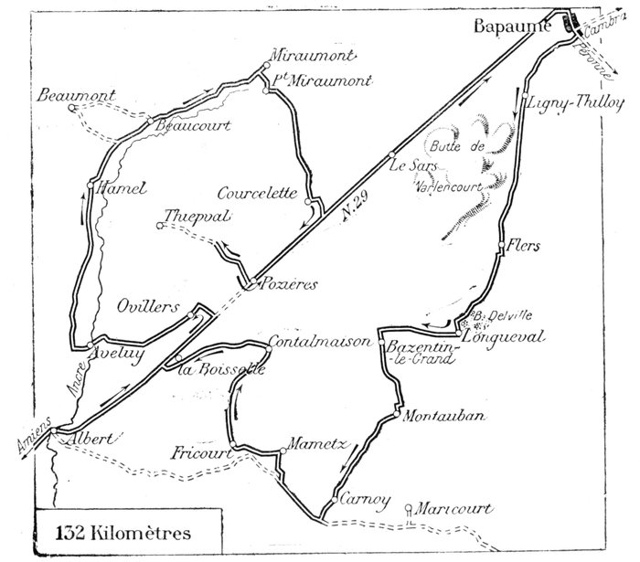 At the entrance to the village, a "calvary" is passed, of which nothing remains but the stumps of four large trees. Keep straight on through the ruined village to the G.C. 201 (main road from Amiens to Péronne), 1 km. beyond it. Turn to the left and return direct to Amiens via Lamotte-en-Santerre and Villers-Bretonneux, both of which villages were badly damaged during the fighting of 1918.