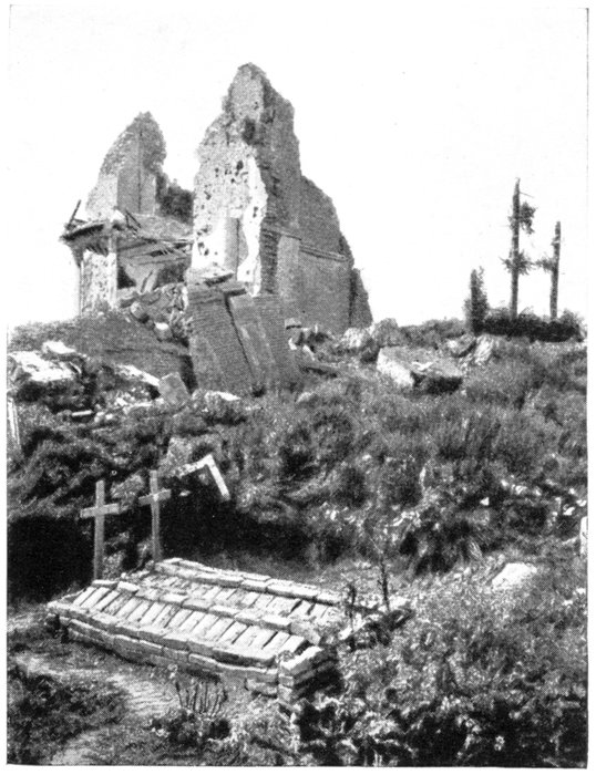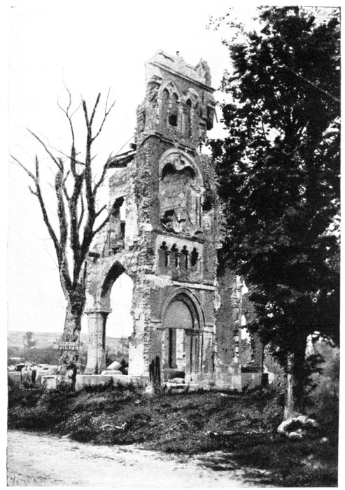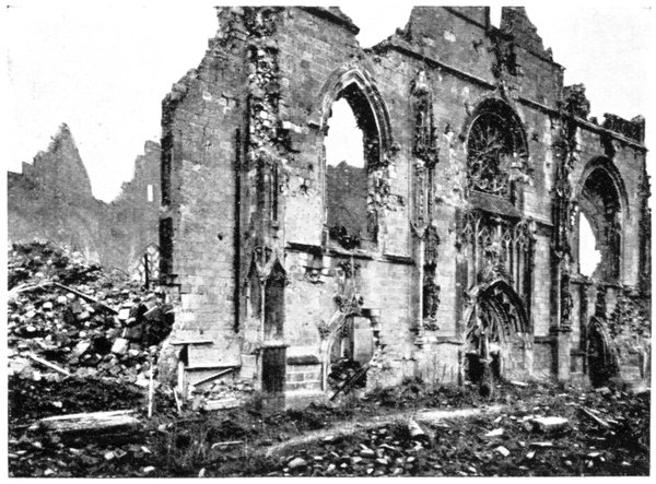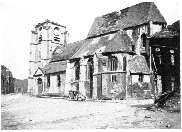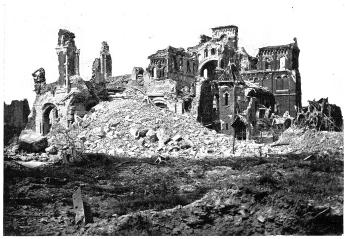 In July, 1916, the church had already lost its tower, roof and vaulting, but the outside walls, the pillars separating the three naves and the three gables of the main façade were still standing. Three months later nothing was left but fragments of broken walls, amidst a shapeless accumulation of débris (photos, p. 133).