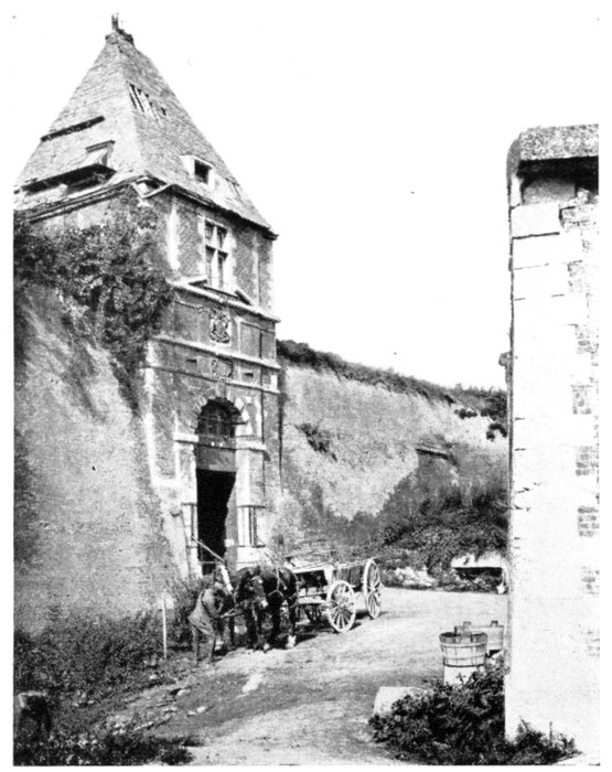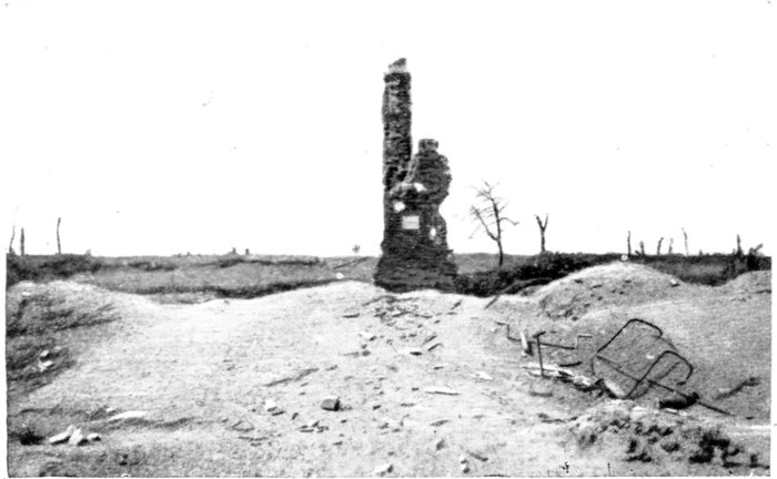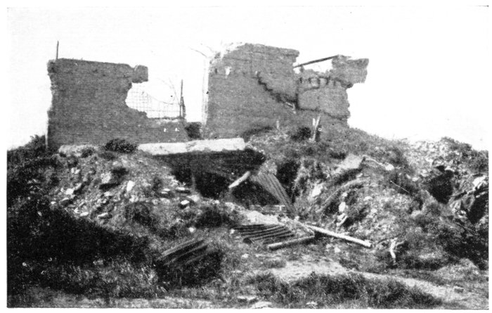 The outbuildings were still standing when the late war broke out; to-day they form a shapeless accumulation of débris. The park was entirely cut up with German entrenchments, of which only a few concrete machine-gun posts and underground shelters with concrete entrances remain. The fine old trees of the park were reduced by the shells to mutilated stumps.