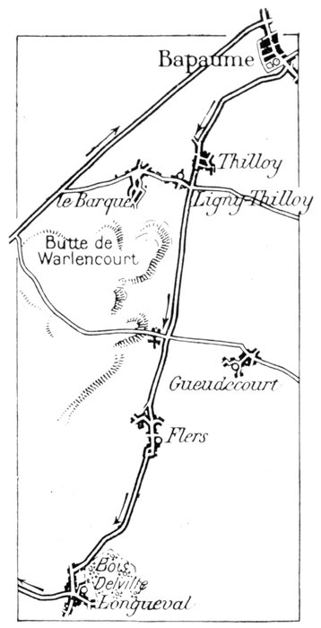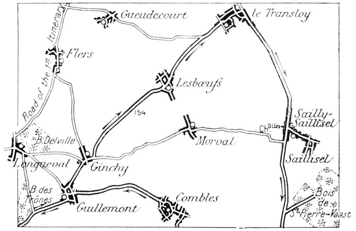 Skirt the southern end of Chaulnes Wood, near which, on either side of the road, are two powerful concrete blockhouses and other German defence-works.
