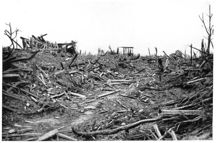 The village was flanked on the north and north-west by dense woods, which were entirely destroyed by the bombardments. These woods were full of fortified works, trenches and posts for machine-guns, protected by wire entanglements.