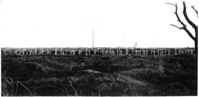 At the crossing of several roads, 3 km. beyond Lihons, take the newly-made road on the right to Herleville. The large French "Camp des Chasseurs" cemetery (photo below) is on the left, about 1 km. this side of the village of Herleville (completely devastated), which is next reached.