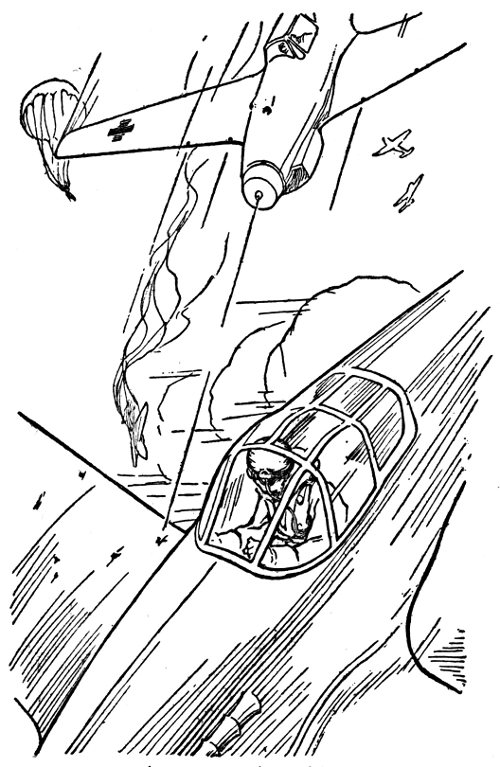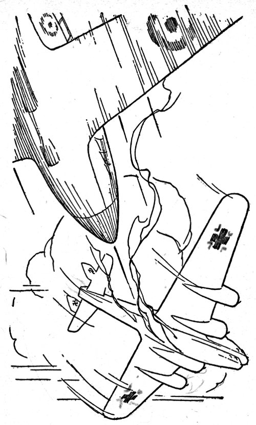 “He—he got him!” Brand’s lips went white as the Tomahawk, after banking so sharply it seemed to stand on its right wing, went into a spin.
