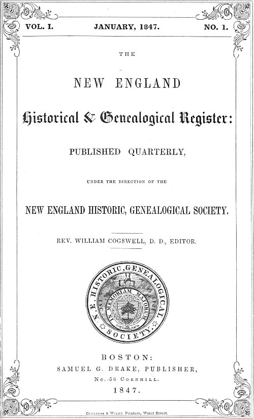 The NEW ENGLAND HISTORIC, GENEALOGICAL SOCIETY proposes to publish by subscription a Quarterly Journal, to be entitled, "The New England Historical and Genealogical Register." The period has arrived in this country, when an awakened and a growing interest begins to be felt in the pursuit, and especially in the results, of Historical and Genealogical Researches; and when the practical value, both to individuals and to society, of the knowledge which is obtained by investigations of this kind, from the scattered and perishable records of local, domestic, and traditionary history, begins to be appreciated by increasing numbers. The existence and active exertions of Historical, Antiquarian, and Statistical Societies, which have sprung up within a few years past in most of the older states of the Union, are a sufficient evidence of this fact.