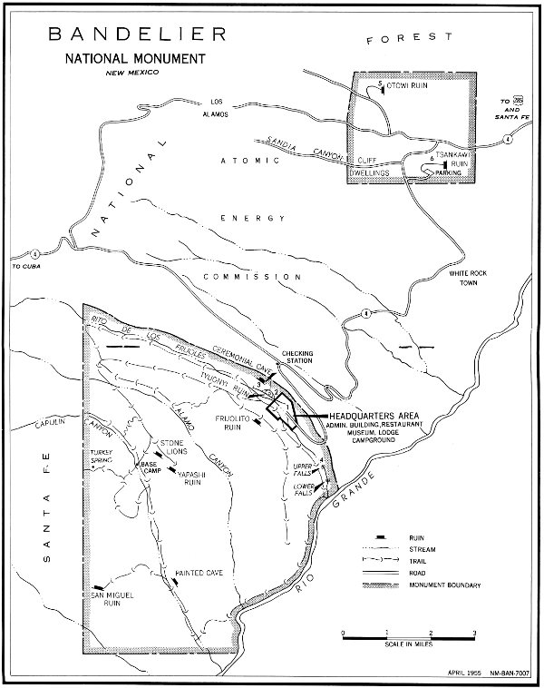 Bandelier National Monument is 46 miles west of Santa Fe, N. Mex., by way of U. S. 285 to Pojoaque, then left onto State Route 4. Coming from Taos and the north, leave U. S. 285 at Espanola, turning right across the Rio Grande. During the summer, access is possible from the south via Jemez Springs and through the Valle Grande on unimproved gravel roads.