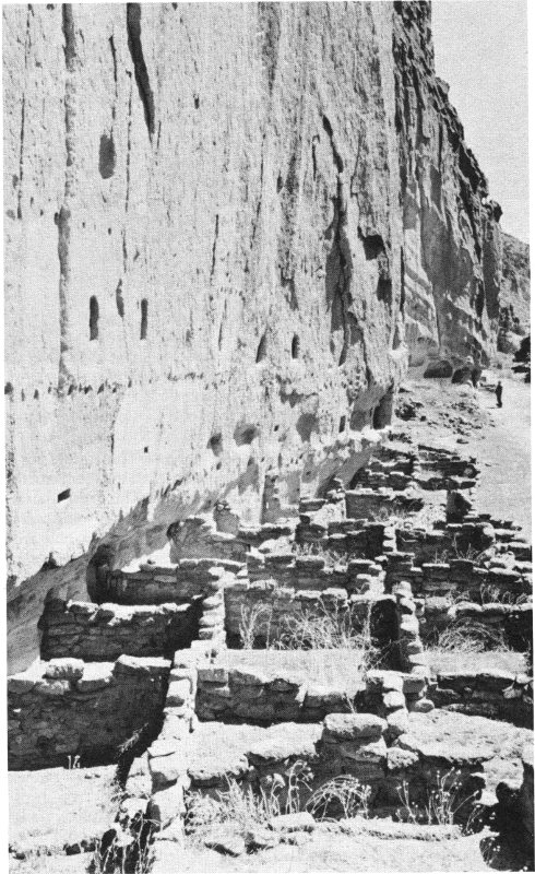 It is uncertain which type of construction is the older—the talus house or the open pueblo on the canyon floor. But one thing is evident—a building of the size of Tyuonyi, previously described, was worked on and occupied by scores of families. In troubled times, this massive structure would have served better for mutual defense than scattered or smaller houses.
