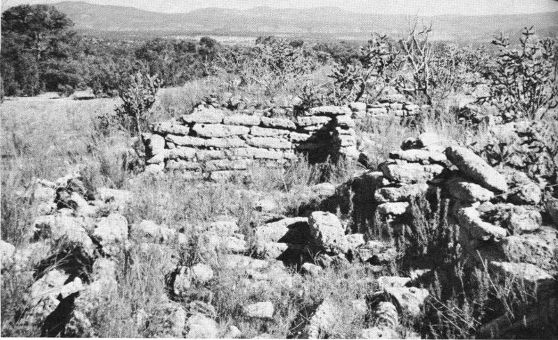 To conclude this general summation of ruin types, some description should be made of kivas. Kivas were, and are, the ceremonial chambers of the Pueblo people; as such, they are universally present in the Pajarito communities and their design makes them identifiable even in the ruined state. The local kivas were always round and were dug almost full-depth into the ground, except for certain examples which were excavated into the relatively soft bedrock of cliff or mesa-top. The circular depressions still to be found in the plazas of the great communal houses are the remains of kivas with their roofs collapsed and with the wind-borne debris of centuries accumulated in the hollows. A more complete discussion of kivas and their functions will be found on page 12.